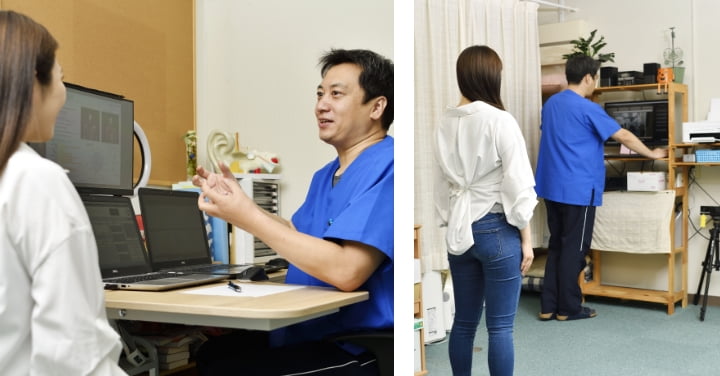 他の治療院では画一的な検査をするところもあるようですが、当院では、ひとつの検査では現れない原因を見つけることができるように、問診・触診以外に姿勢分析、栄養解析、ストレスチェック、アレルギー(過敏症)チェックを必要に応じておこなっています。
